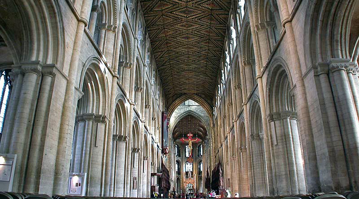 Peterborough Cathedral, England, dating from the early 12th century, is almost contemporary with Durham, but more traditional in its approach to the roof of the nave, which is wooden. It provides an interesting comparison as, apart from the roofing, the naves of both buildings feel similar.