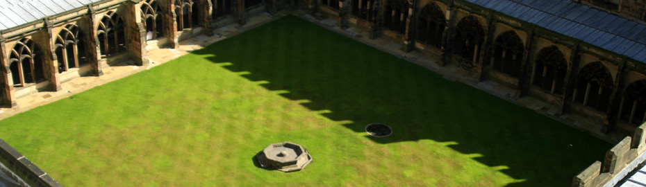 Built in the late 12th century by Bishop Hugh Le Puiset as part of an enlargement of the monastic precinct in response to the recently-completed Norman Cathedral, the cloister was remodelled to their present form in the early fifteenth century, and the tracery later remodelled again in between 1764 and 1769.
