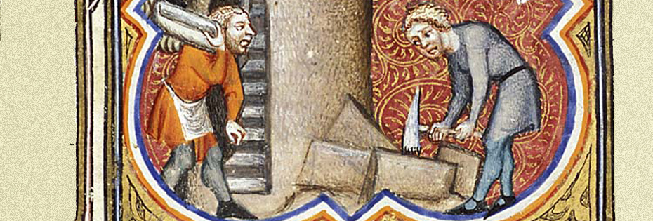 Building in medieval times was as complex a process as it is today, involving an 'assembly line' of craftsmen. This image from a fourteenth-century French manuscript, (Folio 19 of Giuard des Moulin's Grande Bible Historial) illustrates that well.
