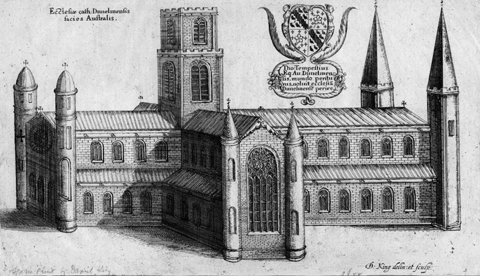 A seventeenth-century illustration of the Cathedral showing the western towers with spires. Although most of the details of the building are inaccurate, it gives some indication of the general appearance of the towers with spires.