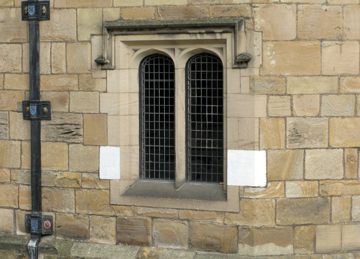 One of the doorways in the courtyard of Durham Castle, showing the white paint, useful during black-outs, that has been periodically repainted since World War II.